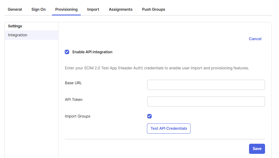 7. Click on the Provisioning tab - click on 'Configure API Integration' button: